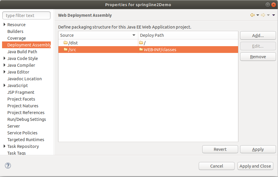 在左侧Deployment Assembly选项卡中,设置项目路径对应的功能