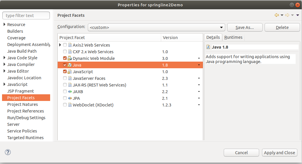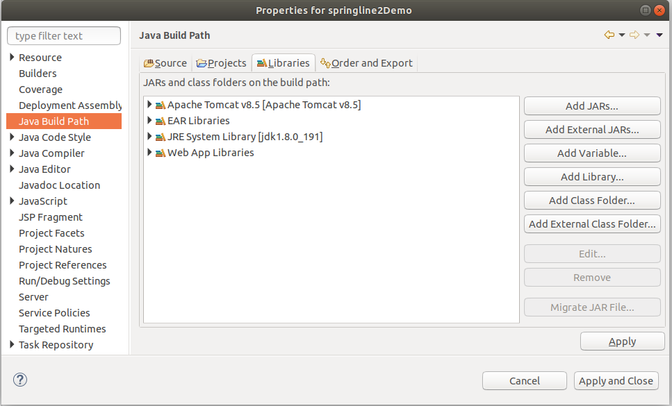 在左侧 Java Build Path 选项卡中,设置项目的依赖信息,主要添加JRE System Library和Server Runtime和Web App Libraries,它们分别为: