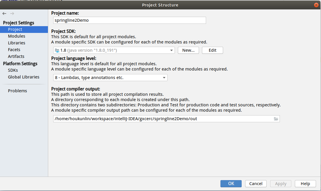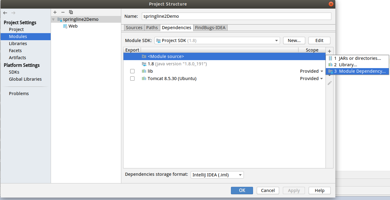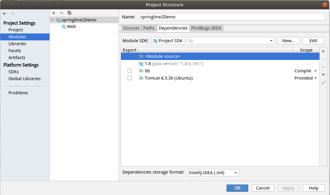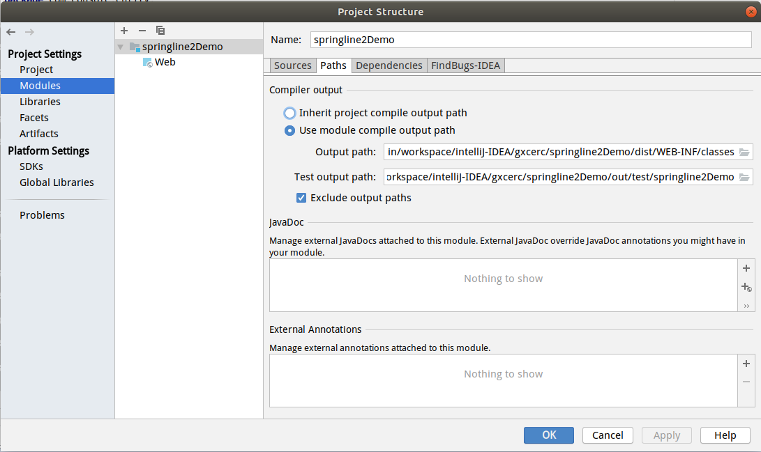 - 在左侧Modules选项卡中设置项目编译输出路径和依赖