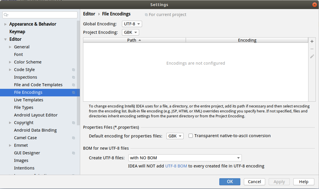 选择菜单:File》Settings进入到设置(快捷键Ctrl+Alt+S),在左侧进入Editor》File Encodings选项,配置项目的编码
